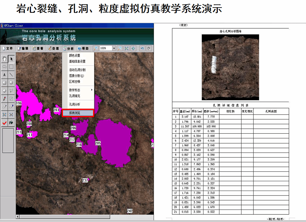 傳統(tǒng)實(shí)驗(yàn)由老師手持巖心實(shí)物、指導(dǎo)學(xué)生觀察、描述巖心。由于巖心實(shí)物匱乏,教學(xué)素材極其有限。通過(guò)虛擬仿真技術(shù),可以通過(guò)各大油田巖心庫(kù)收集國(guó)內(nèi)外巖心實(shí)物的數(shù)字圖像,結(jié)合計(jì)算機(jī)技術(shù)實(shí)現(xiàn)巖心孔洞、裂縫、粒度虛的擬仿真教學(xué)。通過(guò)數(shù)字圖像處理技術(shù)對(duì)巖心圖像進(jìn)行預(yù)處理,快速確定裂縫的邊界,達(dá)到巖心圖像處理和人機(jī)交互方式。研究巖心孔洞、裂縫、粒度圖像分析技術(shù),實(shí)現(xiàn)了自動(dòng)提取孔洞、裂縫、粒度目標(biāo),自動(dòng)統(tǒng)計(jì)計(jì)算相關(guān)參數(shù),并結(jié)合試驗(yàn)室常規(guī)物性測(cè)試和測(cè)井資料進(jìn)行參數(shù)分析評(píng)價(jià),從而解決了以往人工測(cè)定,測(cè)量數(shù)值存在較大誤差,而且費(fèi)工費(fèi)時(shí),轉(zhuǎn)化參數(shù)難度大等問(wèn)題,深化了對(duì)巖心這一地質(zhì)基礎(chǔ)資料的應(yīng)用,對(duì)于裂縫、孔洞型油氣藏的勘探與開(kāi)發(fā)具有重要意義。